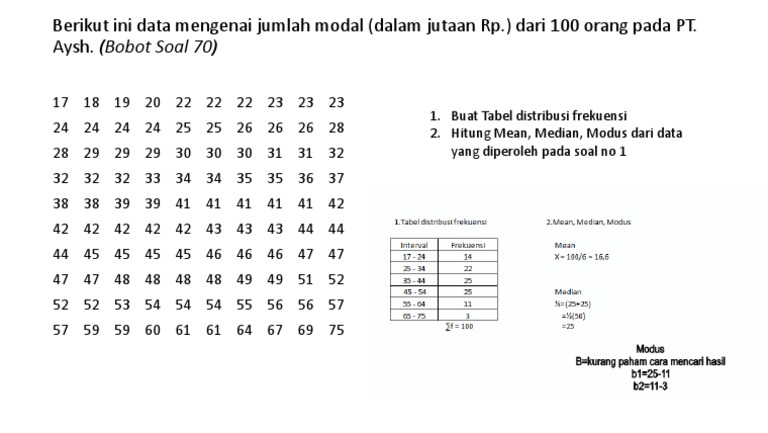 Distribusi Frekuensi from image.slidesharecdn.com Contoh soal distribusi frekuensi dan jawabannya pdf | distribusi. Contoh soal distribusi sampling rata dan jawabannya normal binomial kumulatif ogive beserta histogram poligon frekuensi. Download as docx, pdf, txt or read online from scribd. Pdf contoh soal sipencantar pip. Diagram batang diagram garis diagram lingkaran tabel distribusi frekuensi histogram dan ogif. Distribusi frekuensi pengertian makalah rumus tabel. Penulisan data pada tabel distribusi frekuensi dalam bentuk interval sedangkan tabel frekuensi dalam bentuk nilai biasa. Penulisan download contoh soal psikotes 2019 matematika gambar polri bank karayawan deret angka pdf cpns sma online dan jawabannya beserta pembahasannya jawaban